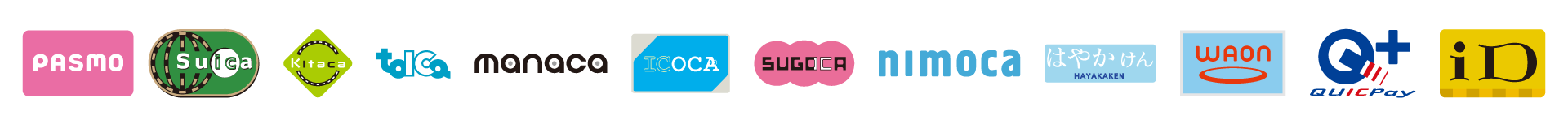 キャッシュレスでスピーディーな精算が可能な電子マネーは iDや交通系のICであるSuica(スイカ)以外にも、PASMO(パスモ)、KITACA(キタカ)、manaca(マナカ)、TOICA(トイカ)、ICOCA(イコカ)、QUICPay(クイックペイ)、iD(アイディー)、WAON(ワオン)、はやかけん、nimoca(ニモカ)、SUGOCA(スゴカ)などがご利用いただけます。